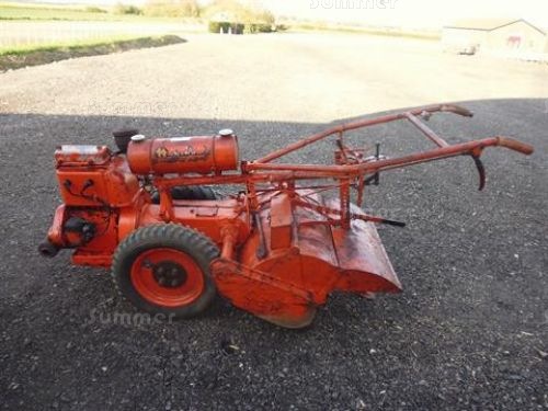 1982: One of the first pieces of machinery the new business aquired was an old 1950s Clifford rotavator, pictured below. The rented 3hp and 5hp rotavators available at the time were simply not powerful enough. This much bigger machine with powered wheels and powered tines was much more effective. But the powered spring tines could throw a brick or stone out of the back at some speed which caused repeated cuts and bruises to shins. It was also an old and unreliable engine which suffered too much expensive down time.