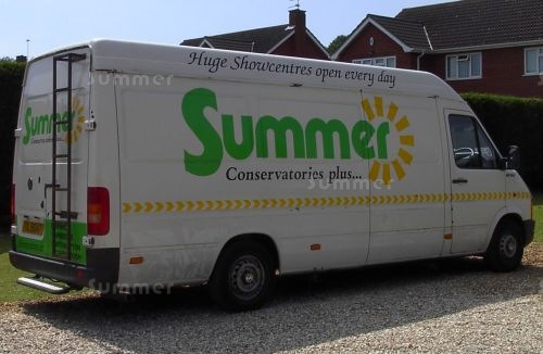 1998: The 3 pictures below show a brand new Volkswagen van. It is a long wheel base high roof van, the largest model available, which our conservatory fitters loved. The strange unfamiliar number plate is Irish. At the time we saved several thousand pounds each time we imported a new van from the Republic of Ireland. In the first 2 pictures the signwriting is not finished and the roof rack and side frail have yet to be fitted. In the third picture the signwriting, the roof rack and the side frail are all finished but the van is not so clean.