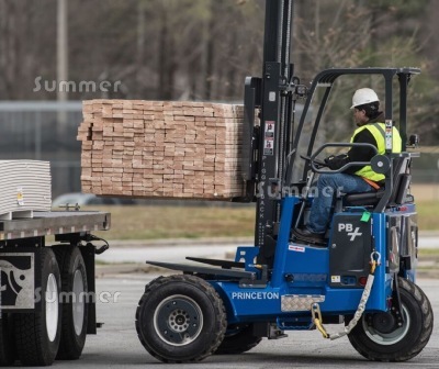 PICTURE: A truck mounted forklift driving sideways with a load.