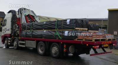 PICTURE: A lorry with a truck mounted crane loaded with 4 cabins and felt tiles.