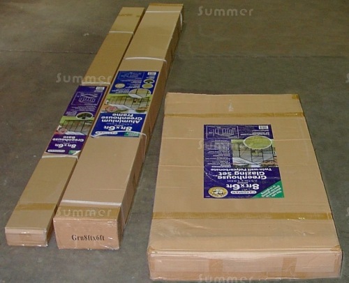- The picture above shows a greenhouse. The longer boxes are the metal components. The other box is the polycarbonate glazing pack.