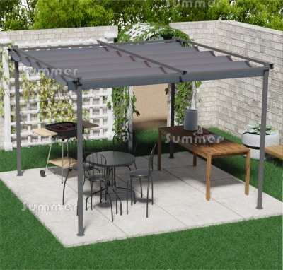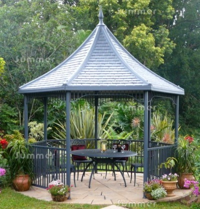 The majority of metal framed gazebos are cheaper and lighter in weight with removable or retractable fabric canopies. Metal gazebos are very popular, normally needing much less initial investment and less effort to install. The majority of our metal gazebos, especially the cheaper ones, are in stock most of the time and available for fast delivery within a few days. We also offer some more substantial metal framed gazebos with a choice of more permanent polycarbonate and fibreglass slate effect roofing.