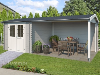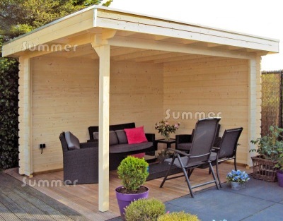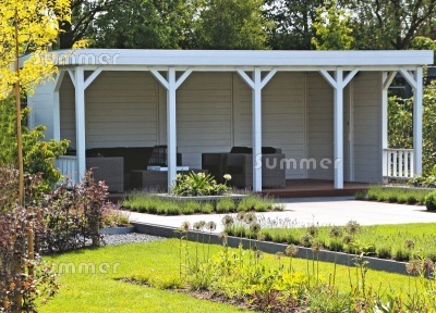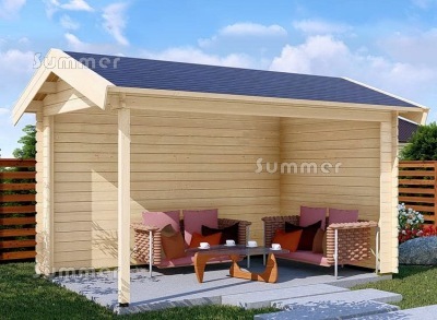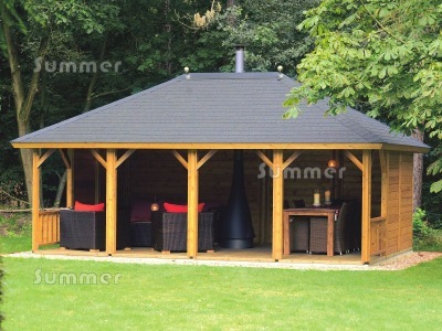 PICTURE: A wooden gazebo with a side summerhouse, a low roof pitch and a fully boarded wall.