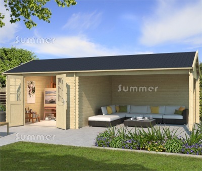 PICTURE: A gazebo with interlocking logs, 1 fully boarded side and a side summerhouse.