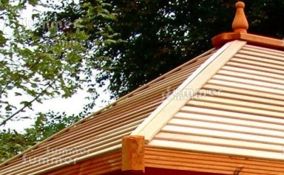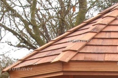 Cedar shingles are available with some of our wooden gazebos. Attractive and durable, cedar shingles make the ideal roof for high specification wooden gazebos. These genuine cedar roof shingles are traditionally made from Western Red Cedar and fitted on top of a felted solid pine inner roof. Each individual cedar tile is a known as a shingle. Cedar shingles have long been a popular roofing material for domestic and public buildings in large parts of North America where cedar shingles have a reputation for warmth and longevity. Cedar has an unrivalled reputation for durability and cedar shingles often last for many decades. A cedar shingle roof takes time to fit, especially if the roof is a hexagonal, octagonal or hipped design, but the results are stunning and most people find it a very satisfying project. The finished roof will also last for a very long time. A cedar shingle roof is easier to fit on a simple apex roof.