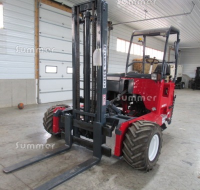 PICTURE: A truck mounted forklift driving sideways with a load.
