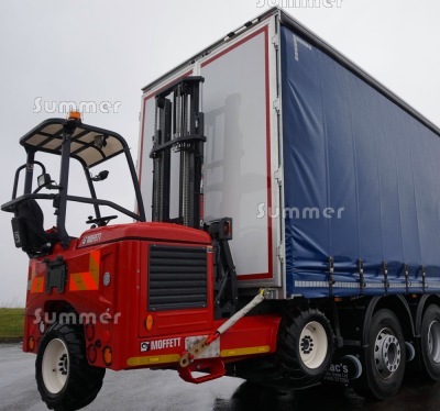 - The delivery vehicle is an articulated lorry with a forklift mounted at the rear.