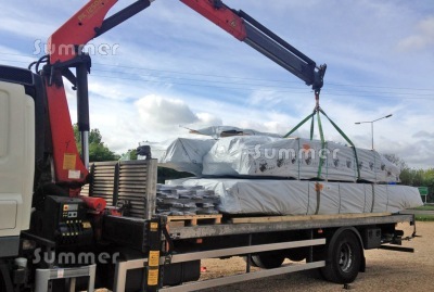 - The delivery vehicle is a flat bed lorry with a truck mounted crane.