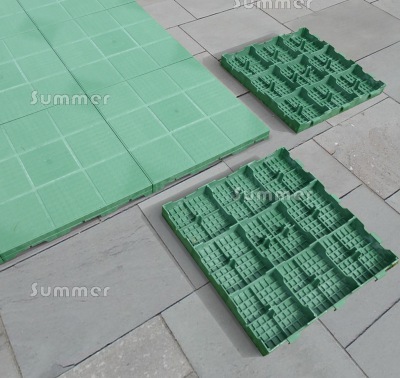All timber is pressure treated which ensures a longer lifespan. Pressure treatment is a lifetime preservative treatment. Each tile is 500mm x 500mm in area with a reeded finish. A small gap between each board allows for expansion and contraction of the timber in varying climatic conditions. If required, substantial timber bearers can be used below the tiles allow ventilation under the floor which reduces dampness inside the building. If required, timber bearers should be at least 2"x2", pressure treated and spaced around 10" or 250mm apart.