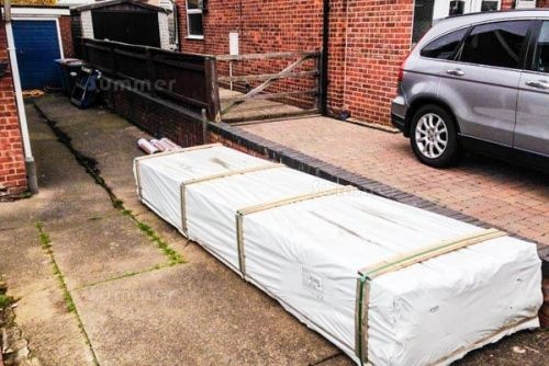 - The pack is covered on all sides with opaque black or white polythene which protects it from the elements and conceals the contents. It can remain outside for a week or two before installation.