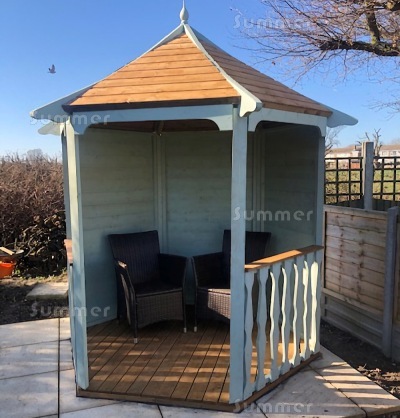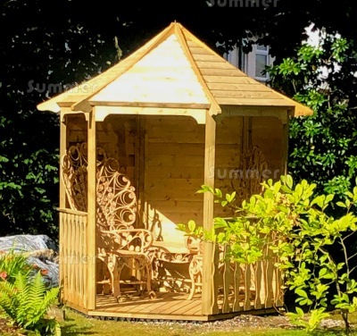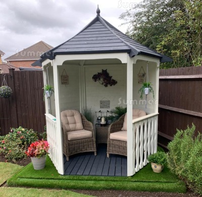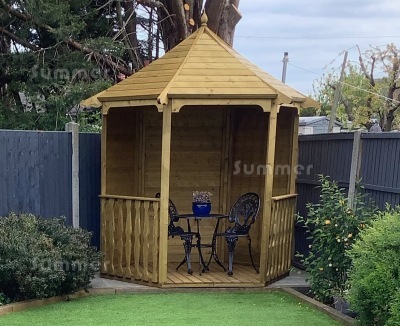 HEXAGONAL BUILDING SIZES: For ease of reference these hexagonal gazebos are measured as a rectangle. The first dimension listed is the overall width from side to side and the second dimension is the depth from front to back. The overall width is measured at the widest point from corner to corner. The depth is measured at the narrowest point from wall centre to wall centre. Sizes are sometimes rounded to the nearest nominal size for ease of reading but the correct external wall sizes are listed alongside the price. These sizes do not include the roof overhang. Many other suppliers quote the overall roof size which is much larger. All sizes are approximate.