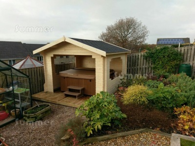A HOT TUB COVER OR A HEAVY DUTY GAZEBO: This log cabin can be used to cover or enclose a hot tub or spa. Smaller hot tubs will pass through the door opening. Larger hot tubs are positioned before the cabin is installed. There is enough space inside to comfortably accommodate even a large hot tub. This versatile cabin is also popular as a garden gazebo which can be used as a shady retreat in the summer or as a store for garden furniture and toys in winter.