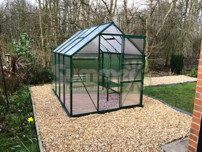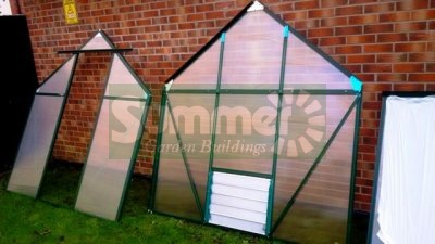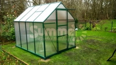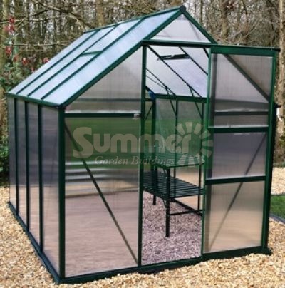 THIS POLYCARBONATE GREENHOUSE: These great value metal greenhouses feature green powder coated aluminium frames with durable twinwall polycarbonate glazing, which is normally an expensive extra. These sensationally cheap greenhouses are always in stock and the price includes fast delivery. From a technical viewpoint this greenhouse is heavier and more rigid than others at similar prices and the glazing is held in better. The precise manufacturing and careful packing is a match for our most expensive greenhouses. Sophisticated features include well retained clip free glazing, additional bracing and numerous specially designed brackets and clips to improve the strength. With such a competitive price this metal greenhouse is a popular choice with first time buyers. With the ultra safe polycarbonate glazing it is also a popular choice for the elderly and families with children or pets.