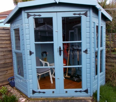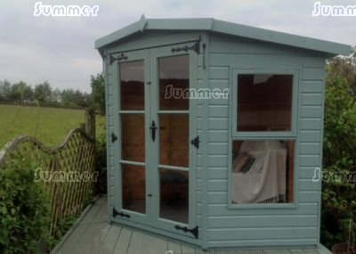 These surprisingly affordable corner summerhouses are 6'x6' (1.8x1.8m), 7'x7' (2.1x2.1m), 8'x8' (2.4x2.4m) or 9'x9' (2.7x2.7m). Features include durable hardwood doors and thicker than normal 15mm tongued and grooved boards throughout - to the walls, floor and roof. Standard features include double hinged doors with black antique ironmongery and two panoramic opening windows. Toughened safety glass is also included. All framing is strong 2" thick planed timber. Instructions are supplied and large prefabricated panels simplify the installation. We offer fitting as a low cost option in many areas. Hardwood doors are now supplied as standard.
